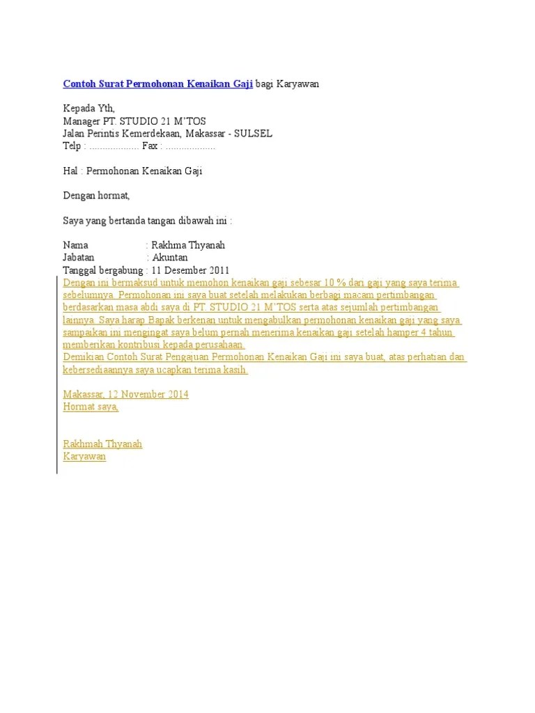 Contoh surat permohonan kenaikan gaji yang bagus kepada yth, manajer pt. Kesempatan kali ini kosngosan akan membahas bagaimana cara membuat surat permohonan kenaikan gaji pada perusahaan. Contoh surat pemberitahuan kenaikan harga barang kepada pelanggan. Format penulisan surat permohonan untuk kenaikan gaji. Contoh surat permohonan kenaikan gaji. Contoh surat kenaikan gaji swasta. Surat rasmi naik gaji surat rasmi e. Sebagai seorang karyawan apabila anda merasa sudah tiba masanya untuk anda menerima kenaikan gaji . Untuk versi full dan doc yang editable, silahkan kunjungi post kosngosan mengenai contoh surat permohonan kenaikan gaji. Untuk kenaikan gaji itu kita biasanya harus membuat surat permohonan kenaikan gaji yang ditujukan kepada perusahaan kita. Surat rasmi permohonan kenaikan pangkat rasmi q. Contoh surat rasmi permohonan kenaikan gaji. Foto copy sk capeg dan sk pns bagi yang diusulkan kenaikan pangkatnya .